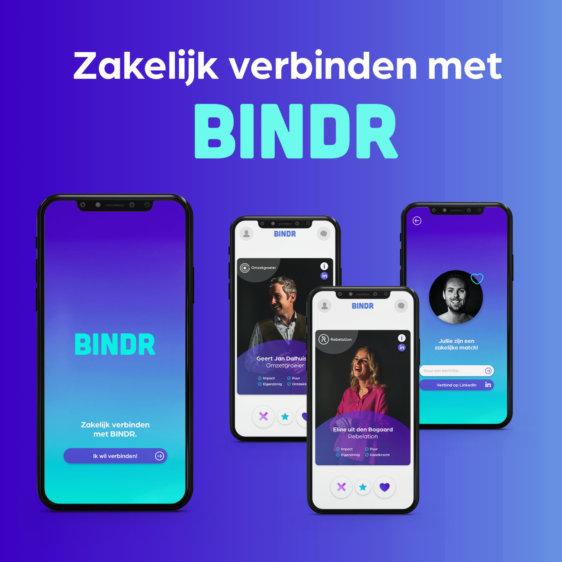 “Wat gebeurt er als je creatieve ondernemers een paar dagen opsluit in één ruimte?” Dat was de vraag die ondernemers Eline uit den Bogaard, Geert Jan Dalhuisen en Nico de Jong elkaar stelden. Ze deden het, samen met alle teamleden van de drie bedrijven. Het resultaat? Een creatief en revolutionair concept dat de zakelijke markt op z’n kop gaat zetten. De ondernemers hebben in zes maanden tijd een app genaamd ‘BINDR’ ontwikkeld die mensen in de zakelijke wereld met elkaar verbindt op basis van kernwaarden. “Het enige dat je hoeft te doen is naar rechts te swipen voor een wensklant of naar links voor een pensklant, het Core-Value-Algorithm doet de rest.”, laat Nico weten.